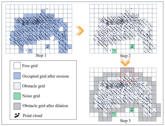 For the scene map with ground point clouds filtered out, it is necessary to extract the ROI and construct a BEV grid map based on the ROI, using erosion and dilation algorithms to mark obstacle grids. The bounding box of the ROI is set according to the actual scene dimensions, . The ROI  is extracted from the point cloud map and projected into a BEV grid map with a scale of  and . In the grid map, as shown in Figure 10: the first step is, if the point cloud density in a single grid is not less than two, the grid is marked as occupied; otherwise, it is marked as free. To further refine this map, erosion removes small clusters of noise or isolated points that may falsely indicate occupancy. This step ensures that the occupied grids more accurately represent significant obstacles or structures in the environment, thereby improving the overall reliability of the map. The second step is, traverse the occupied grids and check the status of their eight surrounding grids. If at least one of the surrounding grids is also occupied, the grid is marked as an obstacle; otherwise, it is marked as noise. The third step is, traverse all obstacle grids and mark the eight surrounding grids as obstacles.