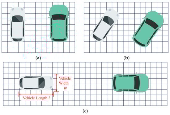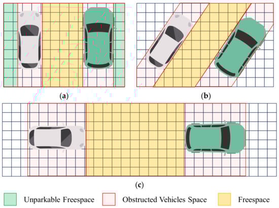 Parking slots classification (based on grid projection). (a) Perpendicular parking space; (b) Angled parking space; (c) Parallel parking space.
