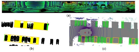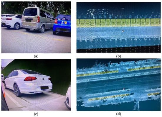 To address the parking challenges in scenes lacking clear or blurred lane lines under complex weather conditions, parking space detection methods based on 3D distance detection have been proposed. The Lidar-based 3D point cloud method is highly resistant to interference from light sources and shadows, providing very accurate 3D poses and rich geometric information for environmental perception, as shown in Figure 2. Figure 2b shows the bird’s-eye view (BEV) perspective of the Lidar 3D point cloud, corresponding to Figure 2a at the same time and place. Lidar detects the distance of objects using the time of flight (ToF) principle, recording their three-dimensional spatial information. The geometric structure information of the object can be derived from the 3D point cloud, which is then projected onto a two-dimensional (2D) image, as depicted in Figure 2c. In existing research, Kamiyama et al. [] used Lidar to measure the reflection intensity of the road surface to identify white-painted parking spaces. This approach, however, is limited to scenarios with white-painted parking lines and lacks generalization across different environments. Gong et al. [] proposed a Lidar-based parking lot localization and mapping method incorporating obstacle semantic information. While this method reduces the workload for downstream parking space annotation, it involves deep learning, making the mapping tasks labor-intensive. Jiménez et al. [] performed parallelepiped detection to determine the occupancy status of parking spaces by analyzing the space above them. However, this method relies on prior information about the parking space location, making it unsuitable for unknown environments. Yang et al. [] used detected 3D bounding boxes to categorize parking spaces formed by adjacent bounding boxes, calculating the minimum free space distance to determine if the space is usable for parking. Despite its effectiveness, the 3D-based method introduces an additional dimension compared to 2D methods (such as images or 2D point clouds []), significantly increasing computational complexity and reducing efficiency in detecting free parking spaces.