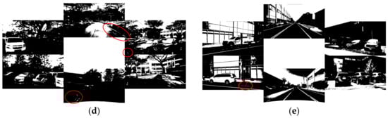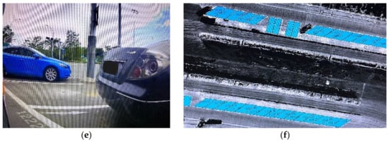 As depicted in Figure 16, combined with the results presented in Table 6, our method demonstrates superior performance. From a principle analysis perspective, the approach of reference [] relies on a pre-trained 3D detection and tracking network. The accuracy of this method is influenced by the parameters of the pre-trained network, resulting in a relative number of missed detections of obstacle vehicles. In contrast, our method begins with ground filtering, isolates the ROI and grid map markers, and reduces the impact of noise points on obstacle vehicle recognition. Figure 18d demonstrates the binarization effect of parking lines without corner points in the scene of Figure 15a. The binarization effect shown in Figure 18e corresponds to Figure 15b, where parking lines are marked, but the texture of the ground area and parking lines in the image is similar due to excessive light. While rich visual texture can provide accurate and clear prior map information for parking space recognition, it is heavily influenced by lighting conditions. When texture information is weak or absent, AVM/Lidar fusion [] fails to deliver satisfactory parking space detection performance, as indicated in Table 6. Whether in parking lots or roadside parking lots, the number of missed parking spaces by this method exceeds 50%. Therefore, compared to both the three-dimensional detection method and the visual prior information-based detection method, the proposed algorithm demonstrates robustness and reliable performance.