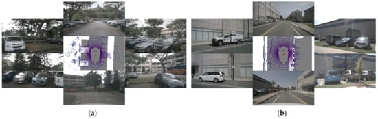 Examples of parking scenes in nuScenes []. (a) A parking lot in Queenstown, Singapore; (b) A on-street parking area at Boston Seaport.