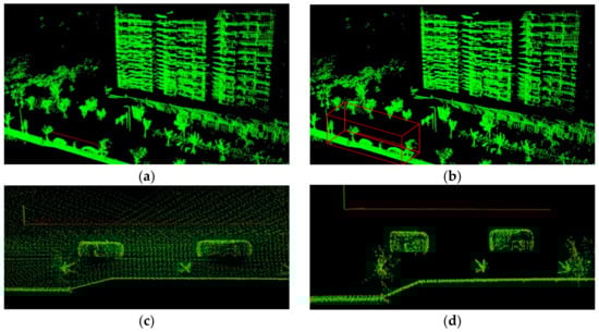 3D point cloud map of a test scene and ground filtering of the ROI. (a) 3D point cloud map of a test scene; (b) 3D point cloud map of a test scene with an ROI box; (c) Before filtering out ground points in the ROI; (d) After filtering out ground points in the ROI.