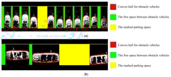 Figure 16 first shows the three-dimensional point cloud map of a test scene and the ground-filtering effect of the ROI. Our method performs well in mapping the scene and filtering ground points within the ROI. The convex hull detection of the obstacle vehicles and the marking of vacant parking spaces are illustrated in Figure 17. The red convex hull line in Figure 17 is a schematic representation of obstacle marking. Figure 17a shows the parking space marking result for perpendicular parking spaces, while Figure 17b depicts the marking result for parallel parking spaces. In Figure 17a, the green area represents the free space between perpendicular obstacle vehicles, and the yellow area indicates the marked perpendicular parking space. In Figure 17b, the green area represents the free space between horizontal obstacle vehicles, and the yellow area indicates the marked horizontal parking space. The number 0 denotes a perpendicular obstacle vehicle, and the number 1 denotes a parallel obstacle vehicle.