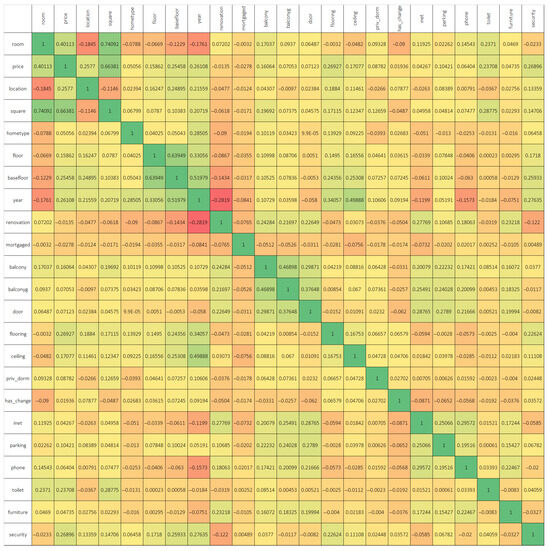 Correlation of numerical indicators of real estate criteria. The heatmap shows correlations between variables, with green for strong positive correlations, red for strong negative correlations, and yellow/orange for weak or no correlation. The diagonal represents a perfect correlation of 1.