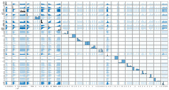 Figure 2 presents a comprehensive matrix of scatter plots and histograms systematically displaying the relationships and distributions among various real estate characteristics. Each subplot on the diagonal represents a histogram showing the distribution of a single variable, such as price, square footage, or the year of construction. Scatter plots off the diagonal illustrate the pairwise relationships between these variables. Variables like price and square footage display right-skewed distributions, suggesting a concentration of data at lower values with a tail extending towards higher values. The year of construction histogram indicates a multi-modal distribution, reflecting distinct periods of intensified building activity. The price-versus-square-footage scatter plot, located in the intersection corresponding to these two variables, shows a positive correlation, where larger properties tend to command higher prices. The correlation between the year of construction and price appears to be weaker, with newer properties occasionally fetching higher prices but with significant variability. Plots involving geographic location (not explicitly labeled here but typically represented) might show clusters, indicating price homogeneity within specific regions or variances in pricing trends across different areas. This plotmatrix is an effective tool for visually detecting trends, correlations, and distributions across multiple dimensions of data simultaneously. The presence of trends or outliers can quickly be assessed, providing a foundation for deeper statistical analysis or the development of predictive models. This matrix format allows researchers and analysts to grasp complex interrelationships and distributions without flipping through multiple charts, streamlining preliminary data exploration and hypothesis generation regarding real estate market behaviors.