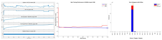 The series of figures provide a comprehensive visualization of the training and validation of a machine learning model over 1000 epochs. The figures include various metrics and parameter changes, facilitating an understanding of model behavior and performance over time. The first graph shows the gradient magnitude across epochs, indicating how the model’s gradients evolve, which affects learning rates and convergence. The graph holds the value of Mu (momentum) constant, and is used to accelerate convergence in a gradient descent. The number of parameters and their sum are squared values, respectively, providing insight into the model’s complexity and weight adjustments throughout the training process. The second graph displays the MSE for both training and testing datasets over 1000 epochs. A marked decrease in MSE is observed initially, stabilizing as the epochs increase, with a minimal gap between training and testing errors, suggesting a good generalization of the model. The final graph presents an error histogram with 20 bins, showing the distribution of errors between predicted outputs and actual targets. The majority of errors cluster near zero, indicating that most predictions are close to the target values. The presence of few large errors suggests occasional deviations from the target values. The stability of the gradient over time suggests effective learning rates, while the constant Mu indicates a set momentum that might have been optimized for this particular training. The steady increase in the number of parameters and their squared sums could imply a complex model that potentially captures a detailed representation of the underlying data patterns. The error histogram and training performance graphs together validate the model’s ability to learn and generalize well, with errors predominantly concentrated near zero and a low and stable MSE across epochs.