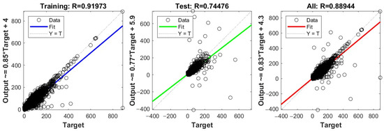 Figure 4 presents regression plots for training, testing, and the combined dataset, each illustrating the relationship between target values (x-axis) and model outputs (y-axis). The training data regression plot (first plot) shows a correlation coefficient of 0.91973, indicating a strong positive correlation between the target and the output values during training. The blue line represents the regression line, suggesting a close fit to the ideal line (Y = T, dotted line), where output equals target, depicting the model’s high accuracy in the training phase. Data points mostly cluster along the regression line, showing good model prediction accuracy with training data.