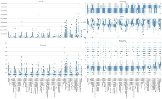 The dataset utilized in this study of apartment sales was extracted on 22 July 2024, from the Kazakhstan real estate sales websites. Data collection was facilitated through a custom scraper developed using Python and the BeautifulSoup library [36]. The examination of this comprehensive dataset of apartment sales in Kazakhstan serves multiple critical objectives. Primarily, it facilitates a deeper understanding of the dynamics within the real estate market in Kazakhstan, encompassing price trends, demand patterns, and the influence of diverse apartment features on pricing. This granular analysis aids stakeholders, including investors, developers, and policymakers, in making well-informed decisions. Furthermore, real estate prices and sale volumes are indicative of economic vitality; thus, analyzing such data provides insights into the region’s economic status and growth prospects. Detailed insights into buyer preferences—such as the importance of location, building materials, and features like balconies and parking facilities—inform marketing strategies and development plans. The development of predictive models for apartment pricing, which incorporate multiple variables, proves beneficial for buyers, sellers, and real estate agents in understanding fair market values and anticipating future price trends. This study also provides empirical insights to local governments and urban planners, supporting the enhancement of urban planning, housing policies, and regulations based on the current housing conditions, offered amenities, and building states. The employment of a custom scraper and sophisticated data analysis techniques underscores the role of technology in the collection and processing of real estate data, potentially setting a benchmark for analogous studies in different locales or sectors. By gathering and scrutinizing a vast array of characteristics across a significant number of observations, this research aims to provide a detailed portrait of Kazakhstan’s housing market, thus delivering invaluable knowledge to various stakeholders engaged in the real estate domain. The dataset utilized for studying apartment sales in Kazakhstan is notably expansive and detailed, covering a broad geographical scope and a wide range of property characteristics. The dataset comprises a significant total of 145,188 observations. It includes data from various locations across Kazakhstan, providing a comprehensive view of the real estate market dynamics within the country. The collected data encompassed various apartment characteristics, including price per square meter, number of rooms, total price, location, living area in square meters, primary building material, floor number, total number of floors in the building, name of the residential complex, year of commissioning, apartment condition, mortgage status, balcony presence, balcony type (glazed or not), door type, flooring type, ceiling height, whether the property was a former hostel, exchange possibility, internet access type, parking facilities, landline telephone connection, toilet type, furniture inclusion, and safety features. Descriptive statistics and a comprehensive dataset description are presented in Table 1. It is imperative to acknowledge that the statistical outcomes and descriptions are specific to the dataset and analytical methodologies employed. A detailed examination of each variable is recommended to fully understand their implications within the dataset. For instance, the ’room’ variable indicates the number of rooms in the property, ’price’ reflects the overall cost, ’pricepersquare’ denotes the price per square meter, ’square’ represents the total living area, ’hometype’ categorizes the construction material of the walls, ’floor’ identifies the apartment’s level within the building, ’year’ signifies the construction date, ’ceiling’ details the ceiling height, and ’security’ describes the level of security in the residential complex.