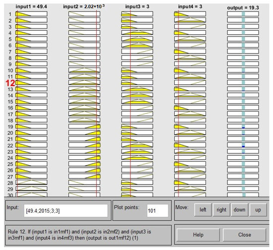 Figure 6 illustrates a graphical representation of a fuzzy logic controller or a rule-based system, and is used in machine learning or control systems to map given inputs to outputs based on predefined rules. Each column represents different variables (inputs and outputs) with their corresponding membership functions distributed across rows, depicted as lines. The highlighted paths indicate active rules and their influence for a specific set of input values. There are four input variables (input1 to input4) and one output variable (output), each divided into multiple fuzzy membership functions (MFs) represented as rows. The specific values for this instance are provided at the top as input1 = 49.4, input2 = 2020, input3 = 3, input4 = 3, and output = 19.3. Each input and output variable is associated with several MFs, which categorize the inputs and outputs into linguistic terms like low, medium, high, etc., visualized through different levels or rows in each column. Highlighted in yellow, these paths show the active routes through the MFs based on the current inputs. The paths link specific MFs across the input variables to a corresponding MF of the output variable. The highlighted rule (Rule 12) at the bottom specifies a conditional logic that connects these input values to the resultant output. It states, “if [conditions on inputs], then [specific output].” This rule and its activation are further evidenced by the yellow lines which connect the dots (MF levels) across the inputs to the output, suggesting which MFs are activated according to the rule’s logic. This visualization helps in understanding the complex relationships and decision-making processes within a fuzzy logic system by showing which rules are triggered under certain conditions and how input values translate into a specific output through logical inference.