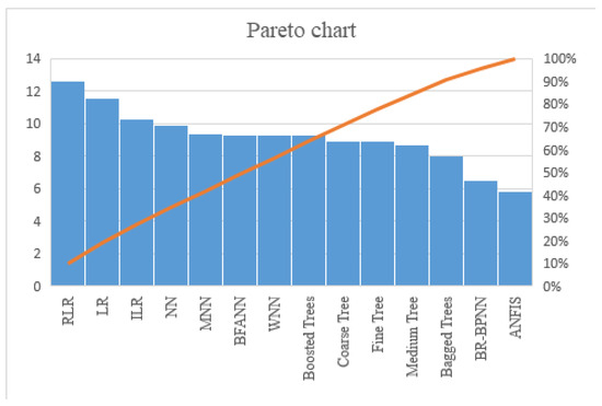 Comparison of ML models. The bar chart shows the performance of various machine learning models, with the minimum value representing the best efficiency. The orange line represents the cumulative percentage contribution of these models to overall performance.