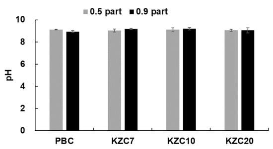 As shown in Figure 2, the pH of the coating color remained largely unchanged across different zirconium contents despite the addition of crosslinkers ranging from 0.5 to 0.9 parts. The pH of all coating colors was consistently maintained at approximately 9. This indicates that crosslinkers from the polyamine and KZC series exhibit low sensitivity to pH variations [38].