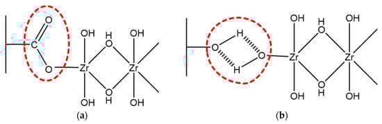 Figure 3 compares the water retention values of the coating colors at different zirconium contents of the crosslinkers. Among the KZC series, the crosslinker KZC7, with a 7% zirconium content, exhibited a water-holding capacity comparable to that of PBC from the polyamine series. As the zirconium content increased, the crosslinkers KZC10 and KZC20 demonstrated slight improvements in water retention compared to PBC and KZC7. The KZC series crosslinkers were added at 0.5 part and 0.9 part, assuming a 100% solution regardless of the actual solid contents of 7%, 10%, and 20%, meaning that much less of the KZC crosslinkers were used in the coating color formulation compared to the polyamine-based PBC. Considering this, the KZC series crosslinkers can be regarded as having better water holding ability than the polyamine series crosslinker. Specifically, the water retention ability of the KZC series showed noticeable enhancements as more crosslinkers were added. This suggests that higher zirconium contents in the KZC series contribute to improved water retention in the coating colors, likely due to zirconium’s covalent bonds with carboxyl groups and the weaker hydrogen bonds with hydroxyl groups of binders (refer to Figure 4). Thus, the water sensitivity can be decreased by crosslinking soluble binders with the crosslinkers or by forming an insoluble net around the binders [10,11]. This observation underscores the importance of optimizing the zirconium content in KZC-based crosslinkers to achieve the desired performance characteristics in pigment coatings.