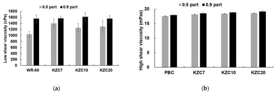 Figure 5 illustrates the viscosity of coating colors with varying zirconium contents of crosslinkers, highlighting its crucial role in the coating process by affecting application uniformity, coating weight control, flow and leveling, drying behavior, equipment compatibility, and ultimately, the quality of the finished product [2,39]. At a low concentration of 0.5 parts, the polyamine-based PBC demonstrated lower low shear viscosity compared to the zirconium-based KZC series, indicating that crosslinker type plays a pivotal role in viscosity at lower concentrations. Interestingly, within the KZC series, low shear viscosity remained relatively stable across a zirconium content range of 7% to 20%, highlighting an insensitivity to zirconium content variations within this range. However, at an increased concentration of 0.9 parts, a sharp rise in low shear viscosity was observed for all crosslinkers. KZC crosslinkers with zirconium contents above 10% exhibited slightly higher viscosities than PBC and KZC7. The zirconium-based KZC series is much more sensitive than the polyamine-based PBC due to the inherent chemical and physical properties of zirconium compounds, which tend to form stronger and more numerous crosslinks within the polymer matrix. This increased crosslink density results in a more pronounced increase in viscosity with the addition of zirconium content compared to the polyamine-based PBC. Moreover, the KZC series crosslinkers were added at 0.5 part and 0.9 part, assuming a 100% solution, regardless of the actual solid contents (7%, 10%, and 20%). This means that much less of the KZC crosslinkers were used in the coating color formulation compared to PBC, yet they still exhibited higher sensitivity in viscosity changes. This suggests that while crosslinker type is a critical factor at lower concentrations, both the concentration and specific crosslinker characteristics influence viscosity at higher levels, which in turn affects the overall quality and performance of the coating process and final product. This insight is essential for formulating coating colors to achieve desired processing and performance outcomes.