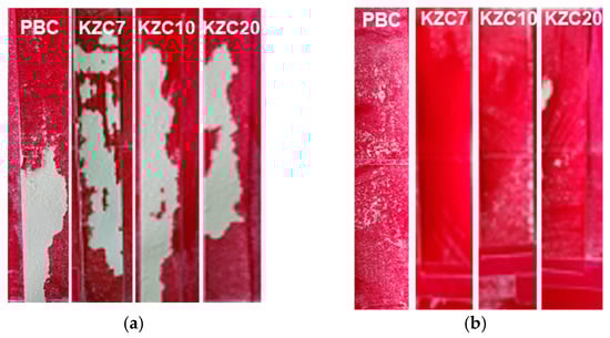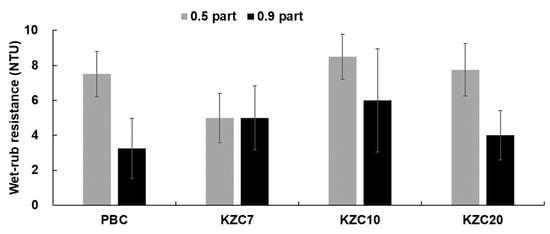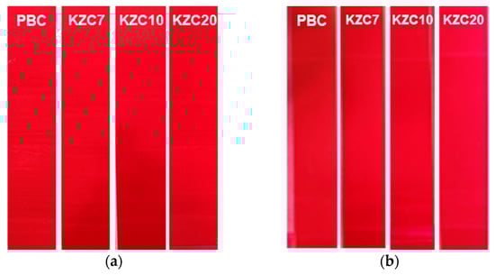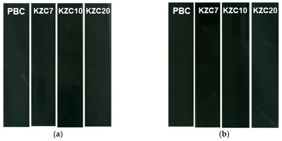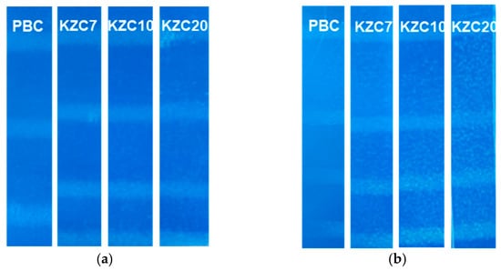 Figure 9 presents images of the ink set-off test of coated paper treated with coating colors containing crosslinkers with different zirconium contents and a polyamine-based crosslinker, highlighting the effects of zirconium content on ink set-off properties. Ink set-off is a crucial parameter measured to ensure that excessive amounts of ink do not transfer from the printed packaging surface to the unprinted surfaces, which can affect the quality and appearance of printed materials [40,41]. At a concentration of 0.5 parts, all crosslinkers, including the potassium zirconium carbonate (KZC) series and the polyamine-based PBC, exhibited excellent ink set-off properties. This suggests that at lower concentrations, the crosslinkers effectively contribute to minimizing ink transfer, ensuring high-quality print results.