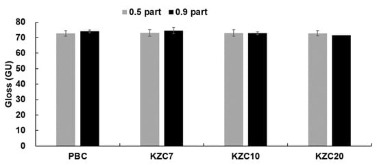Figure 11 compares the gloss of coated papers treated with coating colors containing crosslinkers with different zirconium contents and a polyamine-based crosslinker, showing that the types and concentrations of crosslinkers in the coating colors do not significantly affect gloss. However, it should be noted that KZC20, with the highest zirconium content, showed a slight decrease in gloss. Higher zirconium content in KZC20 may lead to a higher crosslink density within the coating layer. While increased crosslinking can enhance certain properties, such as wet rub resistance [44,45], it can also create a more rigid and less smooth surface, which scatters light more diffusely and reduces gloss [28].