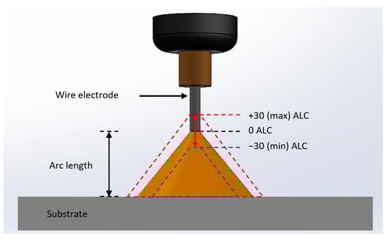 ALC can be defined as the percentage of electrode wire oscillation that alters the arc length and, hence, the arc formation. Arc length can be defined as the distance between the tip of the wire electrode and the substrate, as described in Figure 1. Arc length affects the heat transfer to the substrate [11], the bead’s penetration behavior [12], and spatters [13] during the material deposition process. In the case of the short arc length, the droplets may come into contact with the molten pool while still on the electrode wire and, hence, may lead to a short circuit [14]. Furthermore, if the arc length is too long, the arc’s stability may be affected, and oxidation of the molten metal may occur [15]. This may lead to different defects in the weld bead, such as porosity, penetration, etc. These parameter settings must be adjusted in accordance with the material properties. The WAAM of copper-based alloys presents various challenges, such as porosity, delamination, oxidation, humping, etc.