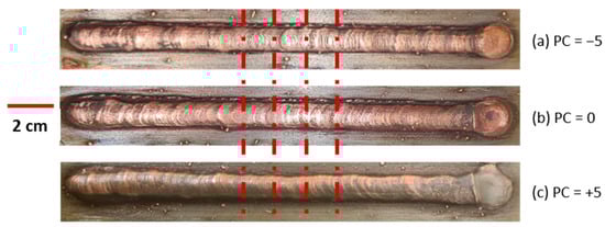 Three distinct values were initially used to investigate the effects of PC on bead penetration, which are −5, 0 and +5. Three layers were deposited on top of each other for each value of PC, and the resulting samples are shown in Figure 2.