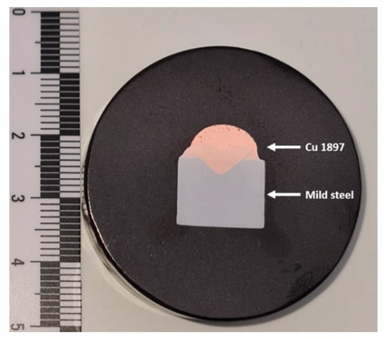 The samples were cut through a wire—electric discharge machine at three sections, as shown in Figure 2, and mounted using PolyFast powder as mounting material. For the specimens to achieve a mirror-like surface finish, their surfaces were ground with an automatic grinding and polishing machine using a series of abrasive papers of SiC (silicon carbide) from 400 to 2000 grit and eventually with diamond suspensions. The specimen at PC = −5 after grinding and polishing is shown in Figure 3.