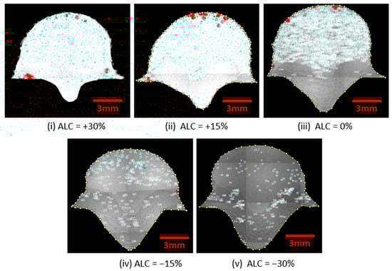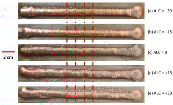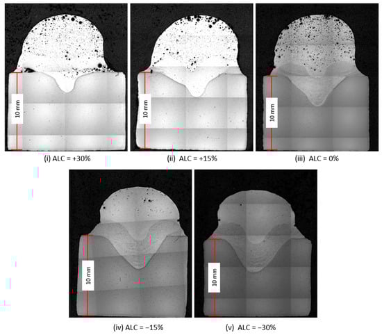 ALC is used to adjust the arc length. The change in ALC affects the heat transfer, arc shape, and droplet properties [11]. Additionally, changes in ALC also affect the mechanical properties [20]. For this investigation, ALC was varied at intervals of 15% from +30% to −30% for specimen preparation using CMT+P. The resulting five deposited samples after grinding and polishing were observed under the microscope, and the results are presented in Figure 7.