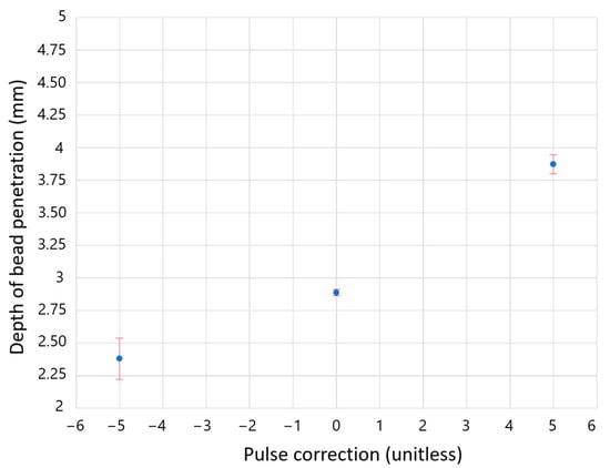 Changing PC from −5 to +5 allows diversion from the pre-set detachment force. A lower PC value, i.e., −5, results in a higher pulse frequency and small size drops [19] and, hence, lower penetration. For the samples presented in Figure 2, grinding and polishing were performed, and it was observed under an optical microscope for penetration study. The results showed that by changing PC from −5 to +5 at intervals of 5, penetration depth increased, and the average of three measured values for bead penetration are plotted in Figure 5.