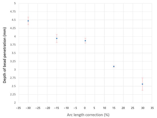 Weld bead penetration was measured using ImageJ; the results are plotted in Figure 8. As the ALC was altered from +30% to −30%, the bead penetration increased. A similar trend was observed in CMT-based welding of AISI 316L by Kannan et al. [21], where the penetration depth increased as the ALC was changed from −5% to −20%. Moreover, Zhai et al. [12] also observed in mild-steel welding that as the arc length increases, the penetration depth reduces. This is because the arc length reduces with a reduction in ALC, and the arc cone is concentrated on a smaller area [22]; hence, the bead’s penetration increases. The highest penetration of weld bead was observed at ALC = −30%, which is 4.47 mm.