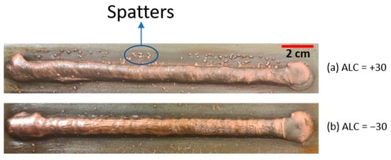 Figure 11. Effects of ALC on spattering in WAAM of Cu1897.
