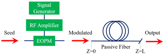 The PRBS phase-modulated monolithic laser system we considered is shown in Figure 1. The PRBS signal was amplified by an RF amplifier and driven by an electro-optic phase modulator (EOPM), and the modulated lightwave entered a passive fiber with a length of L.