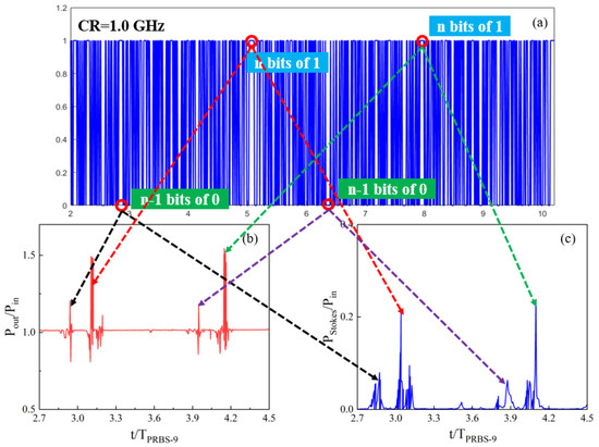 In reference to [23], we knew that the strong pulses in the output waveform were generated by the long dwell time in the PRBS and that the laser and Stokes light produced corresponding pulses during each PRBS period. This phenomenon was elucidated by establishing a time constant for SBS. The laser power at the passive fiber input is 6.4 W, which corresponded to a time constant of about 5.6 ns for SBS establishment. The duration of each bit of the PRBS-9 signal was T = /N = 1 ns; the first longest dwell time was nT = 9 ns, which exceeded the SBS establishment time constant; and the spike of Stokes intensity was gradually generated in the time window of the first longest dwell time. The second longest dwell time needed to run (n − 1)T = 8 ns, which also exceeded the SBS establishment time constant, but the Stokes intensity relaxation oscillation time decreased, and the pulses generated were relatively weak, and the forward output light and backward Stokes light produced second-intensity pulses. A deeper explanation revealed that when the dwell time was longer than the SBS establishment time constant, the laser was equivalent to an unmodulated state, which behaved as a single-frequency signal, which carried a power much higher than the threshold in the actual single-frequency case, resulting in a giant pulse. The third longest dwell time (“1111111” “0000000”) was (n − 2) T = 7 ns, which was close to the time constant of SBS establishment, and the pulses generated were smaller, and in other smaller dwell times, the pulses were not enough time to be established, and SBS could be better suppressed.
