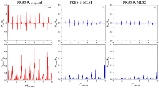 Based on the discussion in the previous section, we analyzed the reasons why the strong pulses in the output light were caused by the longest dwell time in the PRBS signal. This strong pulse greatly affected the stability of the output light in the actual fiber amplifier, and the strong pulse in the backward light would destroy the upstream amplifier. In order to suppress pulses caused by long dwell times, we used two models to adjust and optimize the PRBS: in model 1 (MLS1), the longest run (111111111) was replaced by “101010101”; in model 2 (MLS2), the second longest run (00000000) was replaced with “01010101”. Both and the incident laser power remained constant.