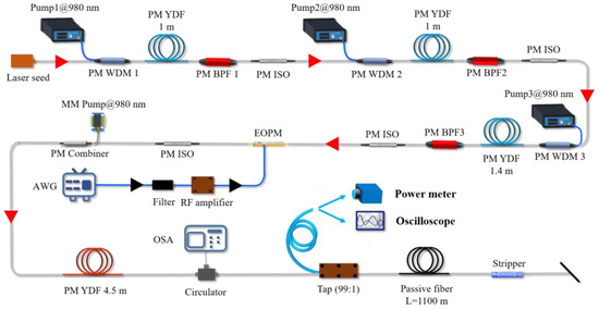 We set up an experimental setup to measure the temporal behavior of SBS intensity, as shown in Figure 5. We employed a low-noise single-frequency laser (NKT, Koheras Basik Y10, Copenhagen, Denmark) with a linewidth of 20 kHz as the seed source, delivering an output power of 10 mW. The seed light was then amplified through three stages of pre-amplification, each stage comprising 1 m of polarization-maintaining ytterbium-doped fiber (PM YDF) with an absorption coefficient of 250 dB/m, and the pump light had a central wavelength of 980 nm, resulting in an amplified output power of 50 mW. Signal generation involved an arbitrary waveform generator (AWG, Tektronix 70001B, Portland, OR, USA) to produce both unoptimized and optimized MLS signals, but the signal emitted from the AWG was discrete. We accessed a low-pass filter (LPF) to flatten the signal so that the phase of the light could be kept on the π modulation, and the signal was then amplified by an RF amplifier and fed into an EOPM to broaden the phase of the pre-amplified seed light. The main amplification stage utilized a 4.5 m long ytterbium-doped fiber with an absorption coefficient of 4.95 dB/m, and the pump optical center wavelength was 980 nm. After the main amplifier, we connected it to the circulator, which could isolate the backward light and prevent the upstream amplification stage from being damaged, and also, it could be used to test the spectral characteristics and waveforms of the backward light. A 99/1 2 × 2 fiber splitter was then plugged in, with 99% of the ports used to output the laser and 1% of the rear ports used to test the return optical power. We used a 1000 m passive fiber as the gain fiber for the SBS effect, which was used to amplify the SBS effect, and finally pumped the stripping at the output with an angle of 8° to strip the pump light and prevent end face reflection.