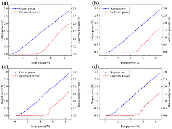 The output power and backward power varied with the pump power using different sequence modulation: (a) the original sequence; (b) MLS1; (c) MLS2; (d) MLS3.
