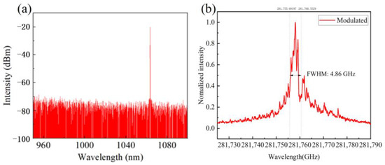 Figure 7 presents the output spectrum with a pattern n of 9, an of 8.5 GHz, an LPF cut-off frequency of 4.4 GHz, and an output power of 2.844 W. As can be seen from Figure 7a, the signal-to-noise ratio of the output spectrum was greater than 50 dB, and the spectrum contains only 1064 nm of signal light, indicating that the SBS effect was well suppressed by phase modulation, and Figure 7b shows a spectral pattern measured by an optical spectrum analyzer (OSA, HyperFine, HN-8995-2, Lightmachinery, Ottawa, ON, Canada) with a resolution of 0.8 pm, and the spectral half-height and width of 4.86 GHz were obtained.