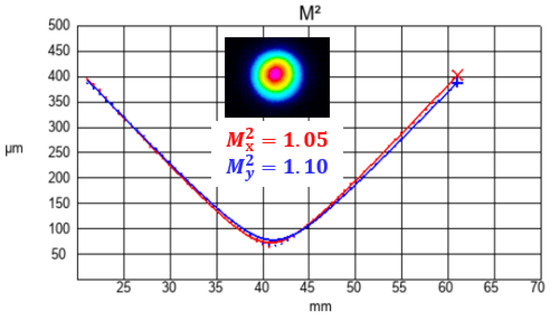 The beam quality at an output power of 2.844 W was measured, as shown in Figure 8. The beam transmission factor in the X direction was , and the beam transmission factor in the Y direction was . The measurement results showed that the beam propagation factor M2 of the laser was close to the diffraction limit of the fundamental mode Gaussian beam.