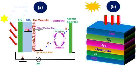 DSSCs consist of several key components such as a photo-anode, a dye sensitizer, an electrolyte, and a counter electrode. The photo-anode is composed of fluorine-doped tin oxide (FTO), coated with a mesoporous semiconductor layer, such as titanium dioxide (TiO2), which provides a sufficient surface area for the dye molecules to be adsorbed. The operation of DSSCs relies on a series of electrochemical processes that collectively convert light into electricity. When sunlight strikes the dye molecules adsorbed on the surface of the TiO2 photo-anode, it excites electrons to a higher energy state. These excited electrons are rapidly injected into the conduction band (CB) of the TiO₂, where they diffuse through the nanoporous structure to the back contact and eventually flow through the external circuit, generating an electric current [45]. Meanwhile, the oxidized dye molecules are regenerated by electrons from the electrolyte, which undergoes a redox reaction. The iodide ions (I−) in the electrolyte donate electrons to the oxidized dye, converting back to tri-iodide ions (), which diffuse to the counter electrode. At the counter electrode, electrons from the external circuit reduce the back to I−, completing the cycle. The working operation is presented in Figure 1a. The seamless flow of electrons through the various components of the DSSC forms the basis of its photovoltaic operation [46,47]. The performance of DSSC relies on factors such as the sufficient surface area of the coated TiO2 for dye adsorption, effective absorption of light by the dye, the efficient injection of electrons into the TiO2, and the rapid regeneration of the dye and electrolyte. It can be fabricated on flexible substrates and operate efficiently under low-light conditions, making it suitable for both indoor and outdoor applications.