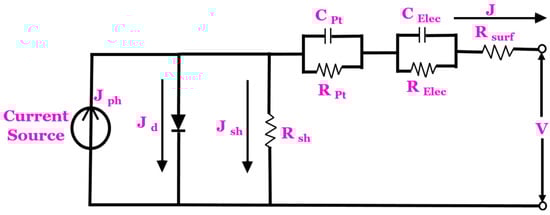The equivalent circuit model of the DSSC is shown in Figure 2. The capacitance element can be neglected since the capacitance at the dye–electrolyte interface tends to be relatively small compared to other factors affecting the performance of the device. Kirchhoff’s current law is used and expressed in Equation (1).