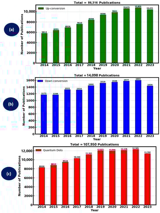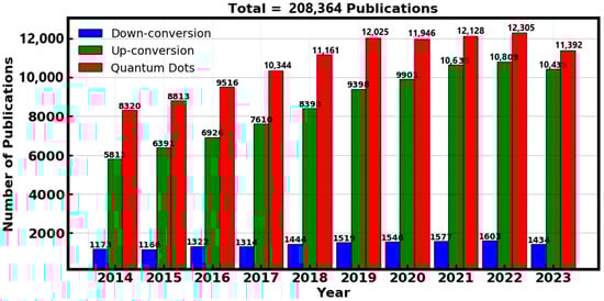 Generally, up-conversion materials are particularly beneficial for utilizing NIR light, while down-conversion materials enhance the use of UV light, and quantum dots offer broad-spectrum absorption. As elucidated above, up-conversion produced a total of 86,316 publications, down-conversion gave 14,098 publications and quantum dots produced 107,950 publications. These created a remarkable research interest of 208,364 publications all combined in the past decade. Each material type also presents unique challenges, such as the stability of quantum dots and the need for precise synthesis and doping in up-conversion and down-conversion materials.