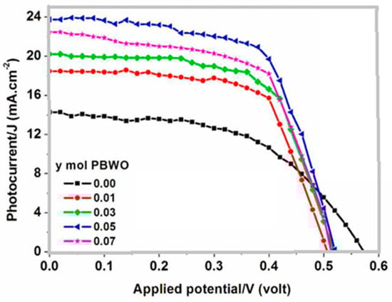 Photocurrent–voltage (J–V) curves of the DSSC based PBWO/TiO2 down-converting photoactive electrodes [56].