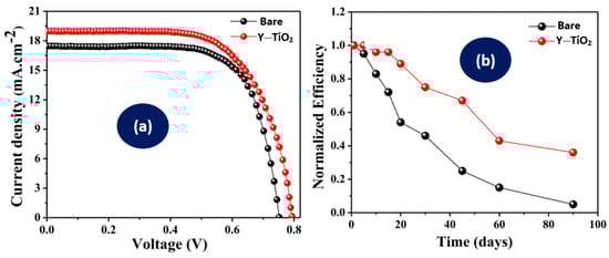 Photovoltaic parameters [59], (a) current voltage characteristics and (b) time variations in normalized efficiencies of bare and UC-based dye-sensitized solar cells.