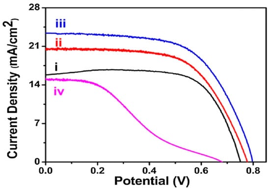 (Variation of I–V characteristics of only TiO2 with dye which shows η = 7.48% (FF = 63%) (i), NFS-GQDs-TiO2-N719 dye with respect to different doped GQDs loading corresponding to different time interval (3 h: η = 9.7% (FF = 71.70%) (ii), 8 h: η = 11.7% (FF = 71%) (iii), and 12 h: η = 5.4% (FF = 50%) (iv)) [61].