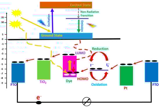The photovoltaic effect in DSSCs is driven by the absorption of photons by the dye sensitizer and the subsequent injection of electrons into the TiO₂. The excited electrons with a lifetime within a nanosecond range are injected into the conduction band of the TiO2 semiconductor, which lies below the excited state of the dye where the TiO2 absorbs a small fraction of the solar photons from the UV region [48]. This is accompanied by the electron transport through the external circuit to the counter electrode. Then, the dye undergoes regeneration, where the excited dye returns to the ground state, and, finally, the electrolyte undergoes regeneration, where the is reduced to the I−. The schematic diagram in Figure 1b shows the representation of the assembled DSSCs, which encompasses the dye molecules adsorbed into the TiO2 and coated on the transparent conductive oxide glass, like the FTO. The dye molecules harvest photons and yield the excited electrons from its highest occupied molecular orbital (HOMO) in the ground state to the lowest unoccupied molecular orbital (LUMO) in the excited state. The electrolyte is for redox mediation and the platinum coated on the FTO to provide counter electrode. The processes involved in the working operation can be broken down into various key steps: