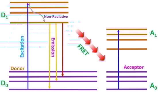 Energy transfer from luminescent materials to dye molecules in DSSCs primarily occurs through Förster resonance energy transfer (FRET). FRET is a non-radiative process where energy is transferred from a donor (luminescent material) to an acceptor (dye molecule) through dipole–dipole interactions. FRET analysis is crucial in measuring changes in the donor and acceptor spectra, which is effective in analyzing energy transfer efficiency [89,90]. This mechanism is highly dependent on the distance between the donor and acceptor, typically occurring over a range of 1–10 nm. Figure 9 shows the FRET mechanism, where the donor transitions from the ground state (D0) to the excited state (D1). Non-radiative relaxation occurred within the lower level of the excited state, which could be phonon-assisted, then the emission and energy transfer to the acceptor via FRET mediation. The excited molecules transition from the ground state (A0) to the excited state (A1) and this process allows continuous energy transfer.