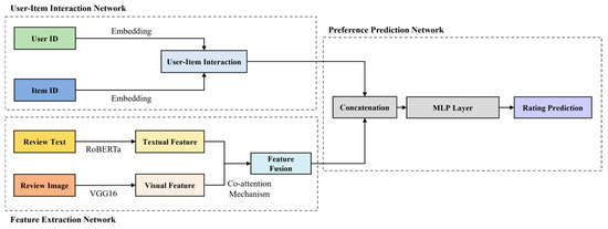 - UCAM [30]: This model predicts ratings by integrating context information into the NeuMF model. In this study, we use RoBERTa and VGG-16 models to extract feature representations from the review texts and images, and then integrate them as context information into the model.
