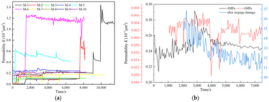 However, certain samples exhibited abrupt changes or fluctuations in permeability before stabilizing, indicating a mutation stage. This stage is particularly important as it signifies a transitional phase where the internal structure of the coal is adjusting to external pressures or fluid flow, leading to sudden changes in permeability. Mainly due to the swelling of the matrix in coal rock by water, the original structure becomes more compact. With the continuous increase in soaking time, the cement is gradually diluted and internal structures are mutually squeezed and destroyed, resulting in increased porosity and ultimately leading to changes in permeability [34]. For example, in samples M-6 and M-9, significant permeability mutations were observed in response to changes in confining pressure (illustrated in Figure 4a). These mutations are likely caused by the dynamic behavior of fractures within the coal, which can either open or close suddenly due to the applied pressure, drastically altering the permeability.