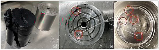 Coal sample after seepage failure (a), the residue of slack on the plug of gripper (b), and slack in water after seepage (c).