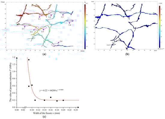 Pressure distribution of fissure fluid (a), velocity distribution map in fissure (b), and relationship between fissure width and the value of pressure reduction (c).