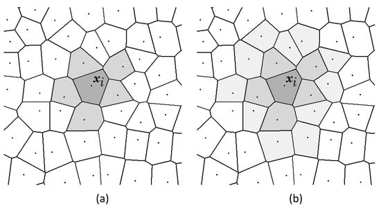 Using the natural neighbour concept, it is possible to automatically establish influence domains, i.e., the nodal connectivity. Thus, in the NNRPIM, integration points inside Voronoï cell will inherit the nodal connectivity of node . In the NNRPIM, the “influence domain” concept is substituted by the similar “influence cell” concept. Instead of searching for the closest nodes, the influence domain of node is formed by the natural neighbours of node , which were already defined by the Voronoï diagram. Thus, two kinds of influence cells are possible: first-degree influence cells, Figure 1a, and second-degree influence cells, Figure 1b. The first-degree influence cells of node are formed by the natural neighbours of node and node themselves. The second-degree influence cells of node are formed by node itself, plus the natural neighbours of node (as a first-degree influence cell) and also the natural neighbour of those first natural neighbours.
