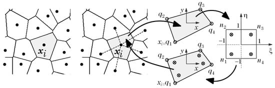 The procedure follows the following steps. First, each quadrilateral of a given Voronoï cell is transformed into a unit isoparametric square, allowing for the distribution of integration points within the isoparametric square respecting the Gauss–Legendre integration scheme [].