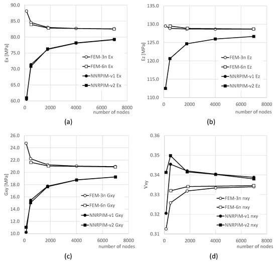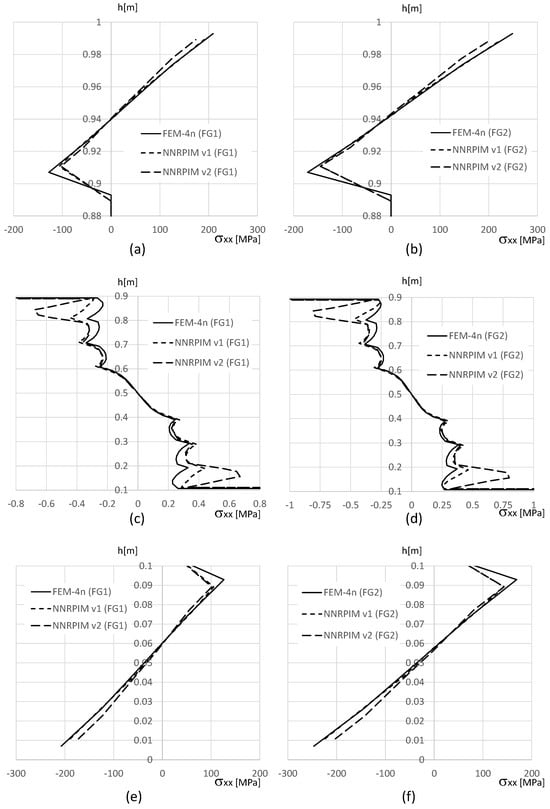 The results show a similar trend with the previous numerical example. The normal stress obtained with NNRPIMv1 differs about 9% from the FEM-4n solution, and the NNRPIMv2 presents higher differences: 16.9% and 17.8% for FG1 and FG2, respectively. As in the previous numerical examples, these differences can be explained by the position of the integration point for which the stress is being obtained (in the following results, this idea can be validated). Regarding the shear stress , the difference between the FEM-4n and both NNRPIM formulations is around 5%.