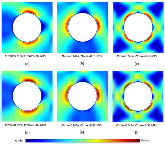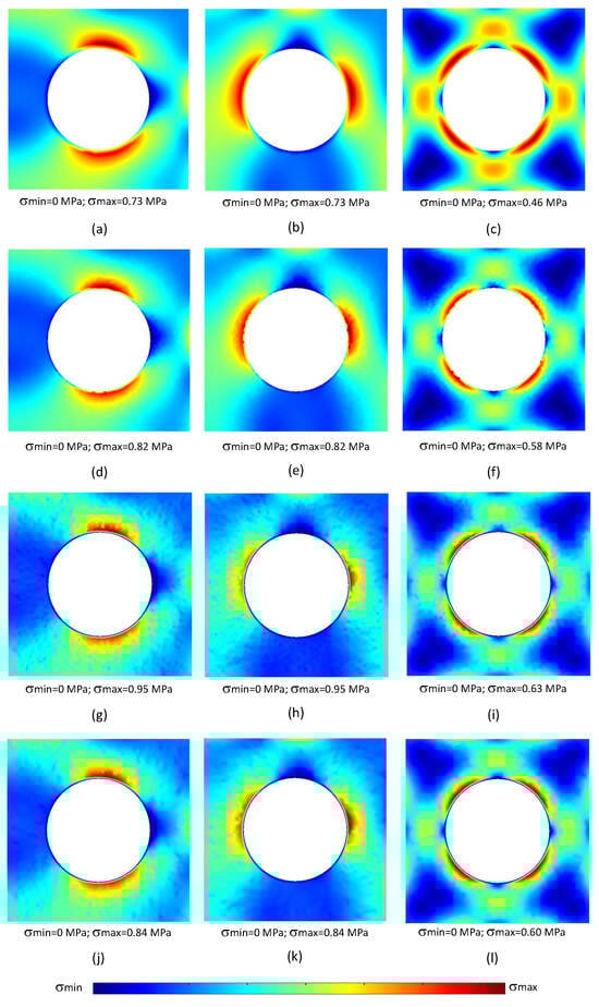 This observed disparity in normal and shear stress confirms an established notion in meshless methods []: when employing a large number of nodes within the influence domain, integration points situated near boundaries (such as point B) tend to encompass larger support domains. This characteristic can introduce a smoothing effect, leading to a reduction in the local magnitude of the variable field. Conversely, integration points positioned further within the physical domain (such as point C) generally possess smaller support domains, leading to sharper approximations of the field values.