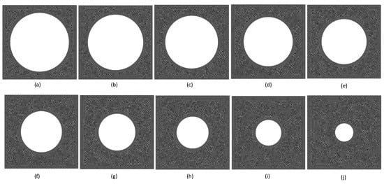 with the problem’s domain represented by . As the expression shows, on the domain’s surface boundary , natural and essential boundaries, and , respectively, can be defined. Thus, external forces can be applied on and displacement constrains can be imposed at . The solid domain can also be under the influence of body forces , acting uniformly on . Since Equation (20) requires both displacement components , they can be defined simultaneously: